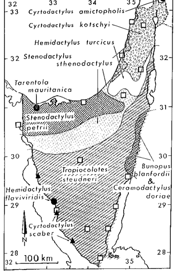 Fig. 4. The Distribution of gecko species (excluding Ptyodactylus) in the survey area, Israel and Sinai. Arrows point as best as possible to non-overlapping portions of ranges; Hemidactylus turcicus occurs throughout the area. Each species inhabits only the suitable habitats within its range. White squares denote localities.