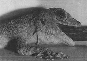 Fig. 9. Adult Ptyodactylus (P. guttatus, male) showing semidilated pupil (in weak light) and toes with bilobed fans (ca. 70 mm snout-vent).